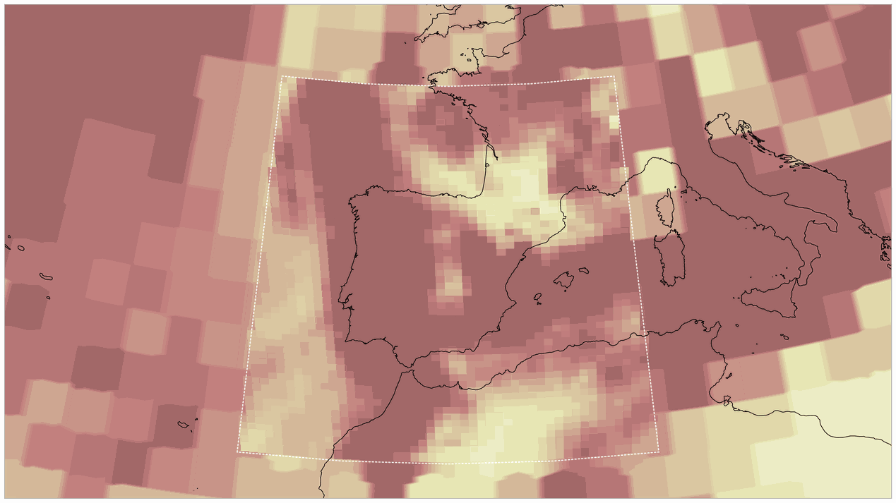 However, the image provides far more information than the abovementioned. For starters, it presents two different resolutions contemporarily. Outside the dotted line, a spatial resolution of around 200 km in the global grid can be seen. But a 25 km resolution can be seen within the dotted line, centered in the Iberian Peninsula and surrounding areas. By focusing on resolving only a region of interest at high resolution we manage to save a tremendous amount of computational resources (and thus, time and energy) when compared to models showing the whole surface at high resolution.